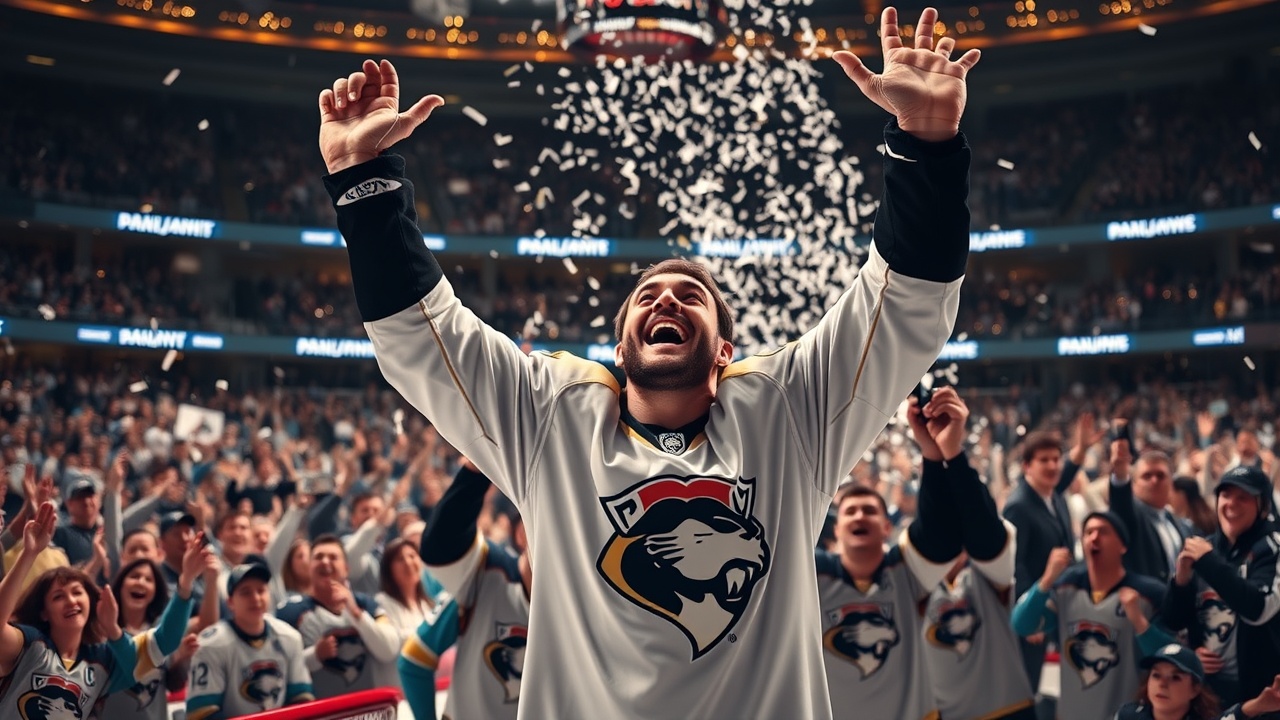 Die Panthers stürmten nach dem Meilenstein das Eis und umringten Marchand zur Feier.