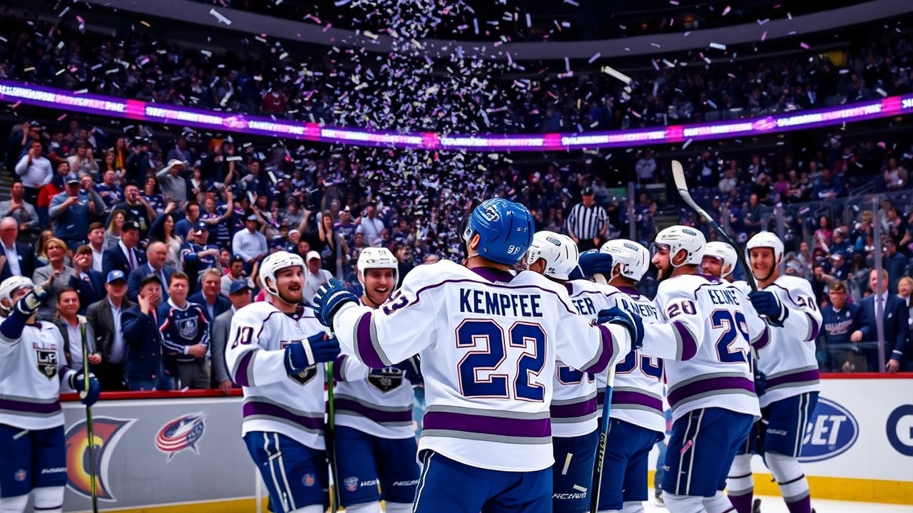 COLUMBUS, Ohio (AP) — Adrian Kempe erzielte sein zweites Tor des Spiels 1:26 Minuten vor dem Ende der Verlängerung und sicherte den Los Angeles Kings einen 5:4-Sieg über die Columbus Blue Jackets am Montag. Mit diesem Sieg rückten die Kings auf einen Punkt an Seattle heran im Rennen um den letzten Wild-Card-Platz der Western Conference.