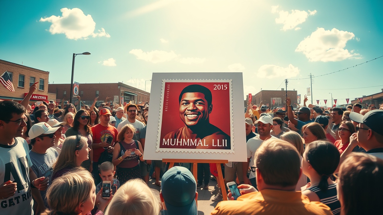 LOUISVILLE, Ky. (AP) — Postbeamte haben am Donnerstag in der Heimatstadt der Boxlegende Muhammad Ali, Louisville, Kentucky, eine Gedenkbriefmarke vorgestellt, die ein Foto des Champions in seiner besten Kampfzeit zeigt. Der Postdienst druckte 22 Millionen Ali-Briefmarken, die ein Associated Press-Foto aus dem Jahr 1974 zeigen, auf dem der Kämpfer seine Handschuhe in einer Kampfhaltung hochhält. Sein Nachname, in fetter schwarzer und roter Großbuchstabenschrift, hebt die Briefmarke hervor.